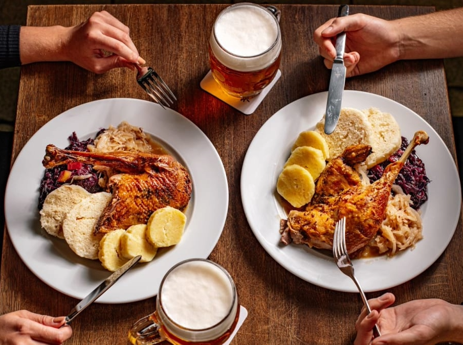 1/4 pomalu pečené husy na kmíně, červené a bílé dušené zelí,